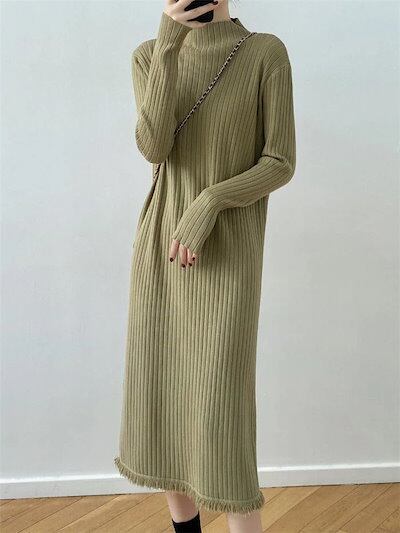 ニットワンピース ニット ワンピース マキシワンピース レディース 秋 冬 ゆったり 体型カバー 無地 カジュアル ハイネック 膝下丈 ワンピース レトロ ニットワンピ リブニット 着痩せ 通勤 気質