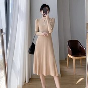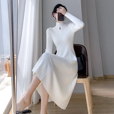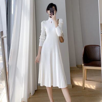 ニット ワンピース ニットワンピース レディースニット ミモレ丈 フレアワンピース プチハイネック 長袖 Aライン タックスリーブ フェミニン オフィス きれいめ 伸縮性 ストレッチ フィット 春 秋