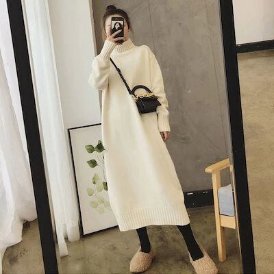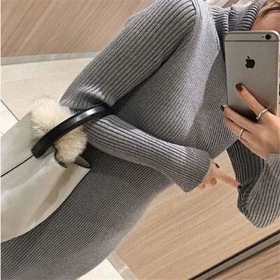 春ニットワンピースチュニック 長袖 セミロングセーター アンダーウェア ワンピース レディース ロングワンピース膝丈ワンピース冬アウタープチハイネック