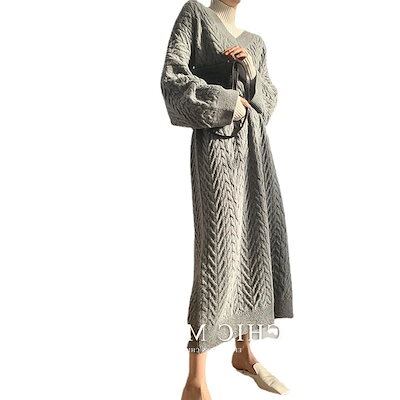 春のワンピースニットワンピース 秋春ロングスカートワンピース女性ゆったりした気質V襟長いスカートタイツセータースカワンピース