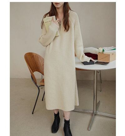 春のワンピース秋ニット フランス 折襟 ニットワンピース カジュアル インナー ロングスカート