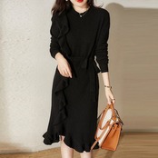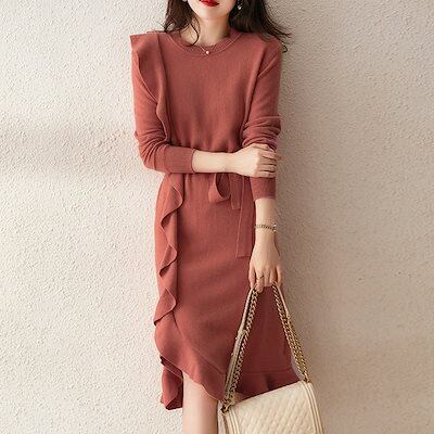 ロングワンピース ワンピース 秋冬 ニットワンピース 気質 着痩せ おしゃれ 長袖 ラッフル ニットワンピ