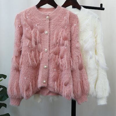 【上品】秋冬 ニットカーディガン デザイン フリンジ パール 高級感 ミンク 気質 アウター カーディガン セーター 百掛け 着やせ おしゃれ韓国ファッション