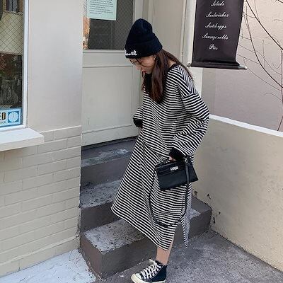 大人気!秋冬裏起毛 ボーダー柄ワンピーススウェット ワンピース ロングワンピース マキシ丈 ントのパッチワーク ゆったり