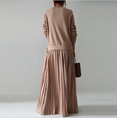 秋冬 新作 長袖 プリーツワンピース 着痩せ 体型カバー ニット ワンピース レイヤード風 Aライン ロングワンピース 重ね風 ロング丈 レディース シンプル 切り替