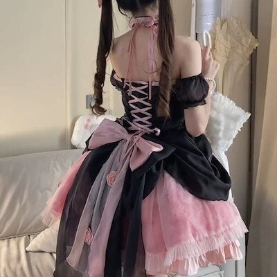 2024 ロリータ ドレス ピンクローズお姫様風ウエストスカート コスプレ ワンピース ロリータワンピース
