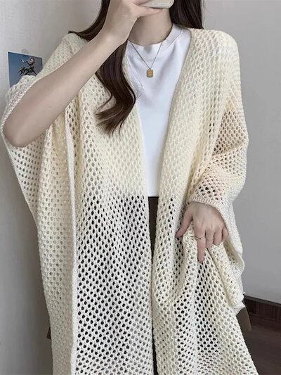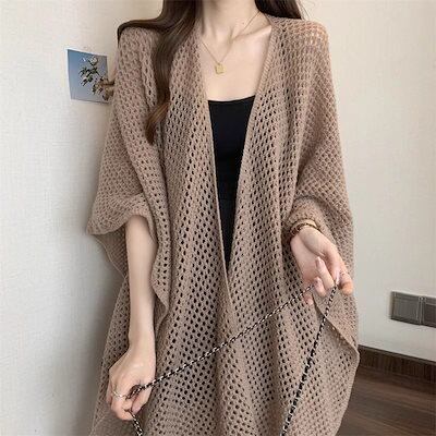 【3日間発送】 2024 新作 秋レディースカーディガン 透かし編みのゆったりとしたニットストールカーディガンの外ハネフィットデザイン感 ブラウス