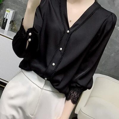 【3日間発送】 2024 新作 秋ブラウス シャツ 秋 Vネック 長袖 薄手 無地 レース シフォンシャツ トップス
