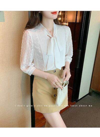 【3日間発送】 2024 新作 秋 シャツ OL 白いシフォンシャツ女性秋の薄いセクションセブン半袖Vネック ブラウス