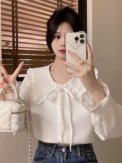 【3日間発送】 2024 新作 秋シャツ レディース 長袖アカデミック ベビーネックの上着 白いシャツ 秋 ゆとりがある 百掛けシャツ 韓国ファッション