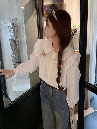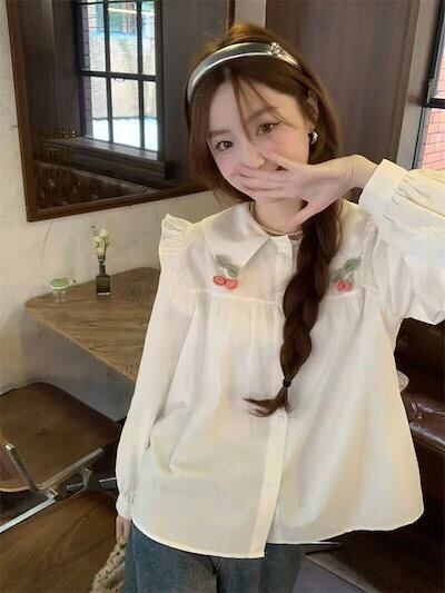 【3日間発送】 2024 新作 秋シャツ レディース 長袖フランス ベビーカラー チェリーのシャツ 百掛けの上着 韓国ファッション