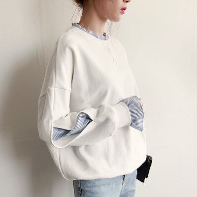 2024 秋 新 パーカー カウボーイパッチワーク偽のツーピーススウェットシャツ女性ルーズ トップス レディース 春 秋 韓国ファッション