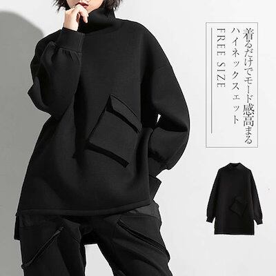 ハイネック スウェット レディース トップス 長袖 スウェット トレーナー プルオーバー 裾変形デザイン アシンメトリー 無地 モード系 個性的 大人 カジュアル メンズ ユニセックス ビッグシルエッ
