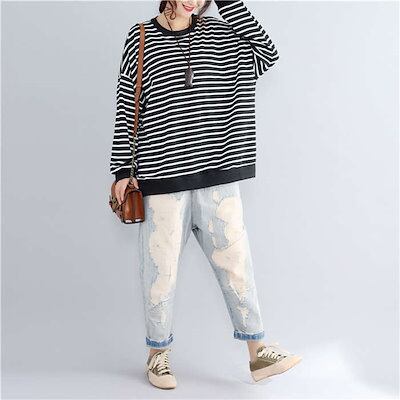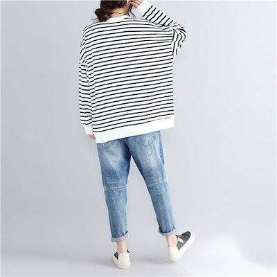 ボーダービッグプルオーバー スウェット プルオーバー レディース トップス カットソー 春 スウェット トレーナー ボーダー 丸首 長袖 パーカー 大きいサイズ ゆったり 綿混 コットン混 春秋 プル