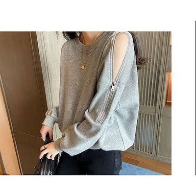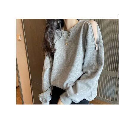 スウェットレディース きれいめ 40代 春秋新作 長袖トレーナー 肩出しブラウス 韓国風 ゆったりトップス 無地 プルオーバー カジュアル 可愛い 着痩せ30代50代