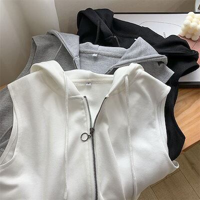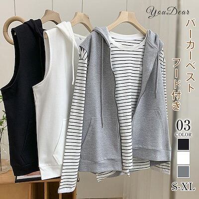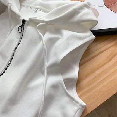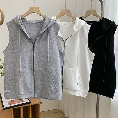 ベスト レディース カットソーベスト ジレ フーテッドベスト トップス ノースリーブ フード付き ベスト ジップアップノースリーブパーカーベスト