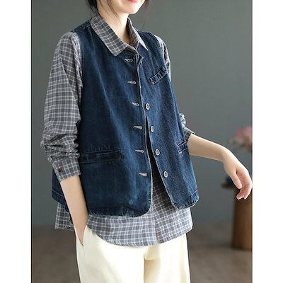 デニムベスト レディース デニム ジレ クルーネック 羽織 前開き 春 夏 秋 カジュアル 無地 レイヤード 重ね着 森ガール ナチュラル きれいめ