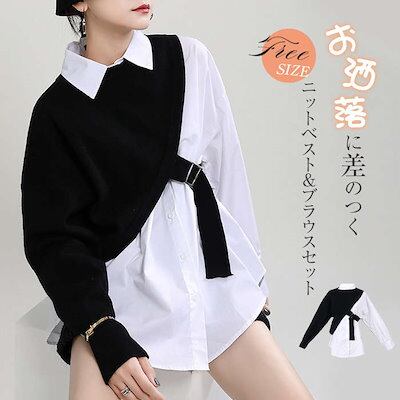 ニットベスト ブラウスセット 変形デザイン アシンメトリー トップス レディース ニットベスト ブラウス シャツ レディース 春 トップス 長袖 ニット ベスト 2点セット レイヤード 重ね着 モード