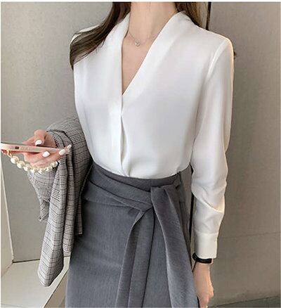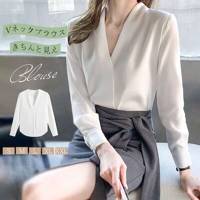 シャツ ブラウス レディース Vネック ブラウス シャツ 長袖 フォーマル トップス 胸元タック 通勤 オフィス 上品 トレンド シフォン 春夏 すっきり 無地 可愛い カジュアル フォーマル シンプ