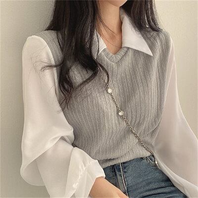 異素材切り替えシャツブラウス 長袖 レディース 春秋 シャツ ブラウス ニット切替え トップス 春 秋 レイヤード風 重ね着 無地 オフィス 通勤 体型カバー オシャレ 可愛い 春ニット トップス