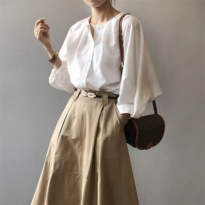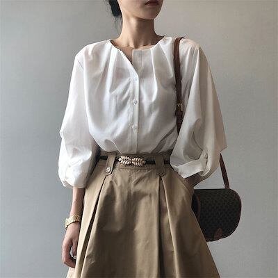 ブラウス レディース ボリューム袖 おしゃれ 春夏新作 クルーネック オフィス 綿麻 七分袖 オシャレ 前開き 透け感 カジュアル タック コットンリネン 大きいサイズ 体型カバー ゆったり 通勤