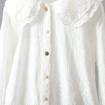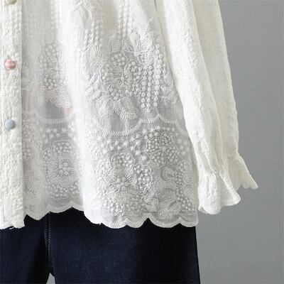 シャツ レディース 長袖 シャツ お洒落 オフィス ブラウス ガーゼ 春 夏 綿100% 花柄刺繍 コットン ビッグカラー シンプル トップス 体型カバー きれいめ カーディガン 前開き 大きいサイズ