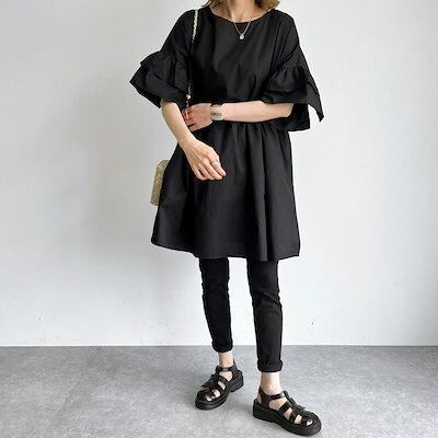 ブラウス Tシャツ レディース チュニック 半袖 春 夏 秋 フレア袖 大きいサイズ ゆったり ロンT ブラウス オシャレ ワンピース ショート丈 カジュアル ウエストギャザー 着回し 体型カバー ゆ
