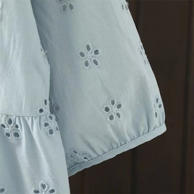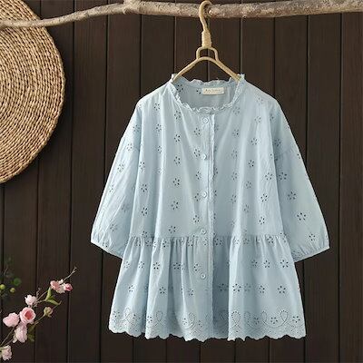 シャツ ブラウス トップス レディース コットンレースブラウス ボリューム袖 綿100% チュニック 夏 花柄 五分袖 刺?花柄 レース フリル襟 トップス 立ち襟シャツ 森ガール キレイめ カジュ