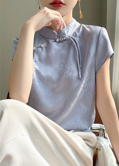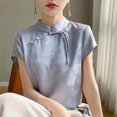 ブラウス チャイナ風 レディース 半袖 トップス 夏 薄手 立ち襟 チャイナトップス シルク風 花柄 刺繍 シャツ スタンドカラー プルオーバー チャイナボタン ゆったり エスニック 光沢 カジュアル