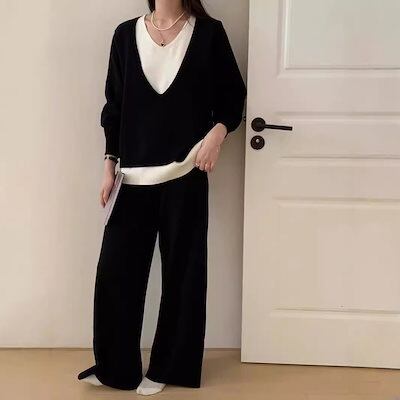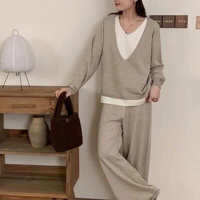 【2枚購入で 2oo円OFF!】高級感 人気なリプニット 二点セット 秋冬 新作 フェイクレイヤード レディースセットアップ カジュアルゆったり 通勤 ニット アウター 上下セット ニット