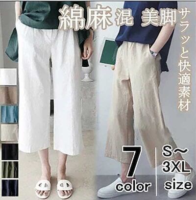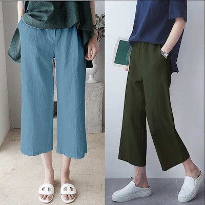 ワイドパンツ ガウチョパンツ ボトムス 涼しい 綿麻風 ウエストゴム ズボン ワイドパンツ ナチュラル 7分丈 レディース コックパンツ シェフパンツ メール便おうちコ