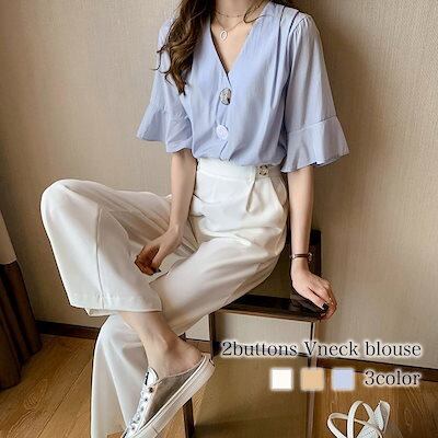 ブラウス レディース 2ボタンVネックブラウス 春 おしゃれ フォーマル カットソー カジュアル レース オフィス 半袖 白 シャツ リボン 事務服 Tシャツ 涼しい 大きいサイズ フリル 安い 人気