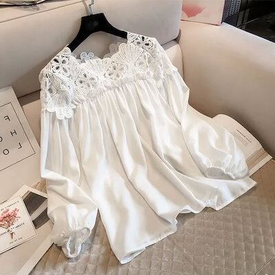 シャツ レース シフォン 大きいサイズ 花柄 レース ぽわん袖 切り替え 長袖 ラウンドネック 春 夏 秋 ゆったり おしゃれ 可愛い ブラウス トップス カットソー プルオーバー レディース フォー