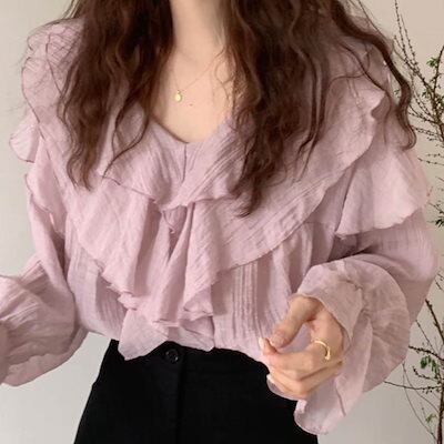 トップス ブラウス シフォン フリル カットソー レディース 個性的 長袖 Vネック フリル 無地 紫 S M L XL 春 夏 秋 きれいめ 上品 清楚 エレガント お洒落 フェミニン ガ