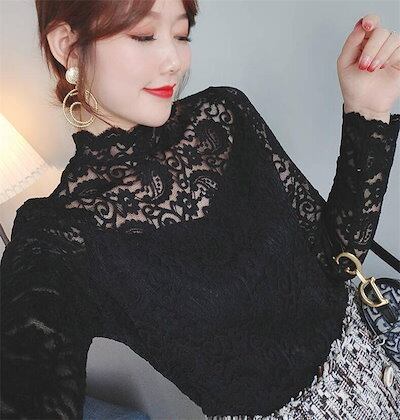 レース トップス レース ブラウス 長袖 総レース 立ち襟 シースルー シャツ ブラウス ハイネック 花柄 レディース 韓国 ファッション おしゃれ 透け感