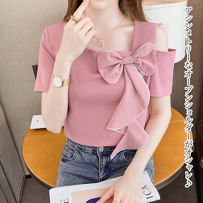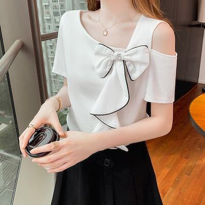 レディース トップス 半袖 Tシャツ リボン アシンメトリー 肩出し オープンショルダー ワンショルダー ゆったり 大きいサイズ 変形 バイカラー 無地 上品 普段着 着回し 女性 黒 ブラ