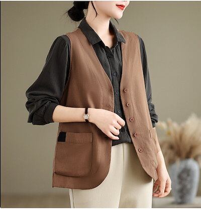 ベスト レディース 綿麻風 ベスト 前開き vネック 春秋 無地 ノースリーブ ショート丈 トップス 袖なし ポケット付き カジュアル シンプル ナチュラル 大きいサイズ ゆったり 大人 レイヤード