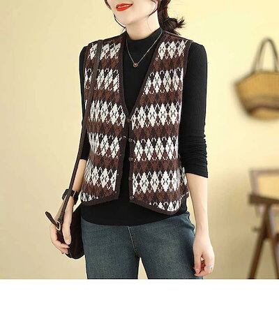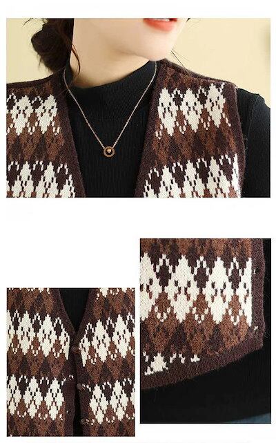 ニット ベスト 幾何柄 レディース 前開き 秋冬 Vネック 薄手 ニット カーディガン ノースリーブ ショート丈 ニットベストフリーサイズ トップス ゆったり キレイめ 通勤 OL 大人可愛い カジ
