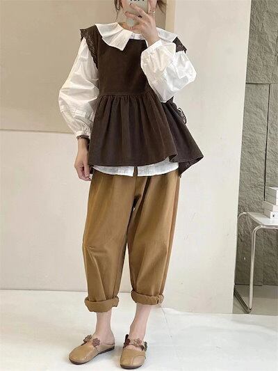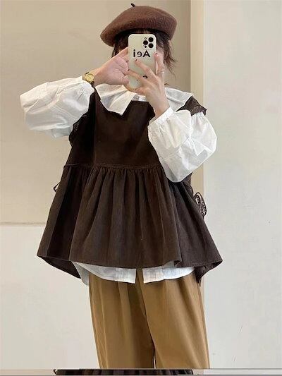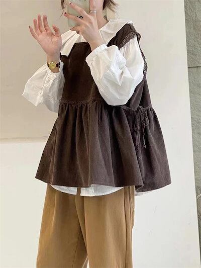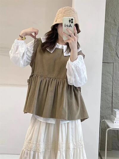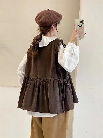 ベスト レディース 秋 冬 ノースリーブ コーデュロイ トップス ベスト レース切り替え クルーネック 無地 着痩せ 重ね着 ナチュラル 大きいサイズ ゆったり 体型カバー 着?せ 森ガール カジュア