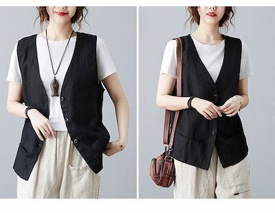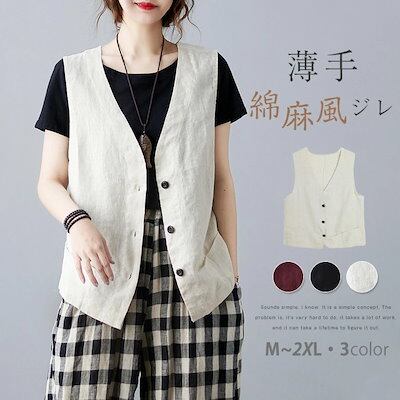 ジレ ベスト レディース 春夏 前開き 可愛い ジレ 夏 綿麻風 ベスト 薄手 夏服 ノースリーブ 無地 カジュアル ベスト Vネック トップス ジレベスト 羽織り 袖なし 大きいサイズ ゆったり 体