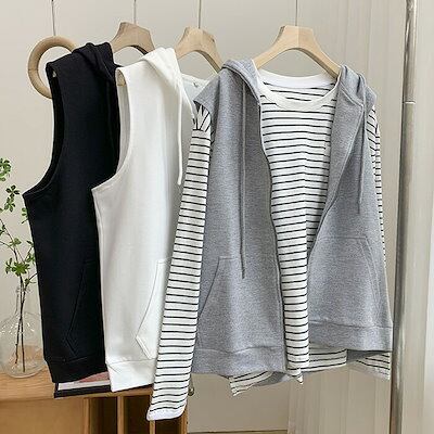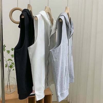 ベスト レディース 春夏 パーカーベスト スウェットベスト ジップアップ 前開き トップス カーディガン ポケット付き アウター ノースリーブ 羽織り 無地 着痩せ 重ね着 大きい 大人 黒 白 グレ