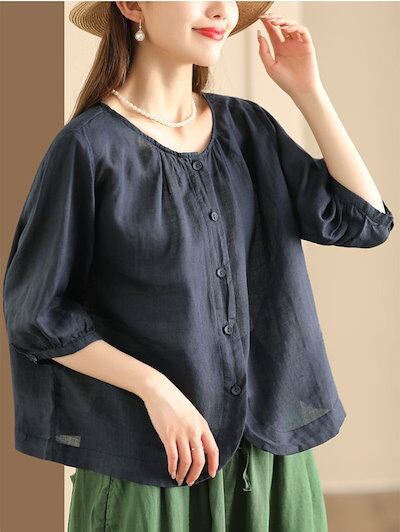 ブラウス レディース シャツ 綿麻風 無地 シャツブラウス クルーネック 七分袖 トップス ショート丈 7分袖 大きいサイズ 着痩せ ゆったり 可愛い シンプル カジュアル ナチュラル 大人 おしゃれ