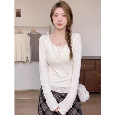 ボトムシャツ 花柄ローネックボトムシャツ女性内側秋新作長袖Tシャツ偽2ピースUカラートップス