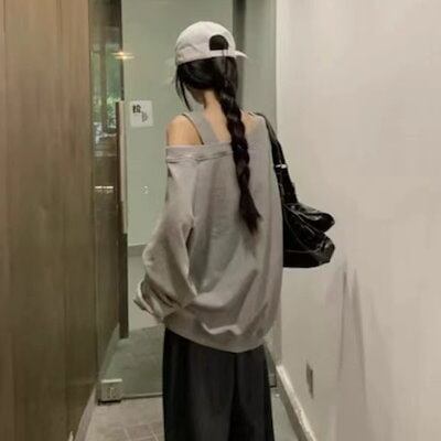 スウェット スラウチーストラップレスルーズプルオーバー長袖ジャンパー女性2024緩い薄いトップス