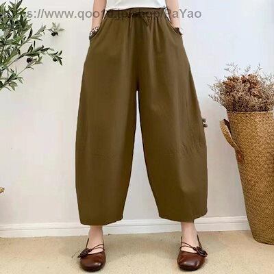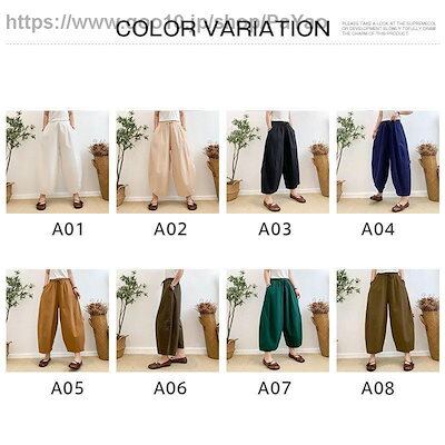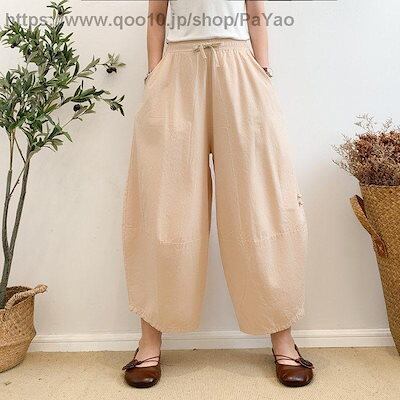ワイドパンツレディースゆったり薄春夏綿麻ハイウエストガウチョパンツナチュラルウエストゴムボトムス体型カバー大きいサイズ