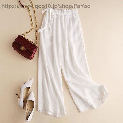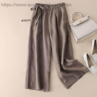ワイドパンツレディースきれいめ綿麻ガウチョパンツハイウエスト長ズボンストレートパンツウエストゴム体型カバー薄ゆったり