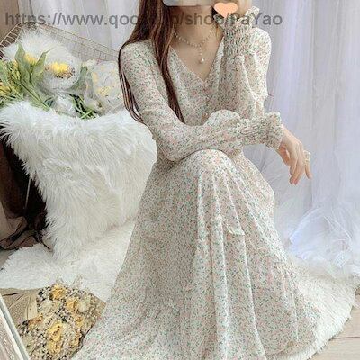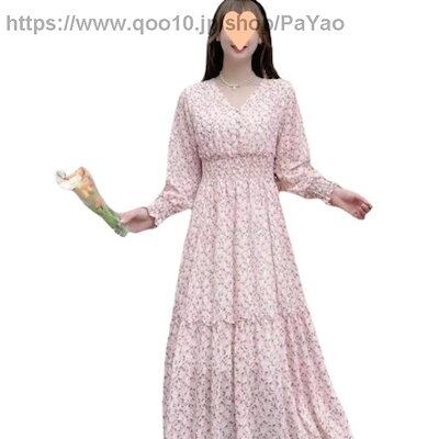 春総柄花柄長袖レディースVネックシフォンミモレ丈夏裏地付きロングワンピースシャーリンググリーンシースルーワンピースゆったり体型カバー大きいサイズパープルかわいいホワイト白膝下丈