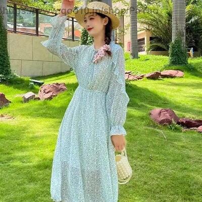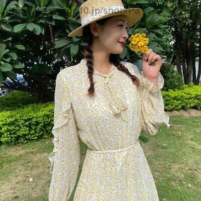 花柄ボウタイレディースミモレ丈総柄ホワイト春ロングワンピース長袖シフォン花柄夏裏地付きワンピースかわいい大きいサイズブルーブラックシースルーピンクフリル体型カバーSMリボンタイワンピース