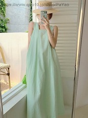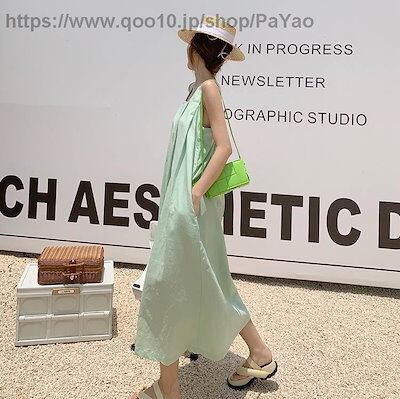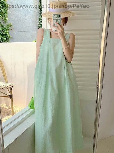 ワンピースレディーススカートマキシ丈膝下袖なしスクエアネックタックAラインワイドバックコンシャンシンプル体型カバーゆったりカジュアル海リゾート清楚グリーンXL大きいサイズ102030
