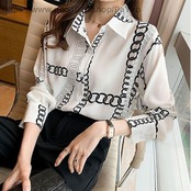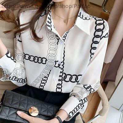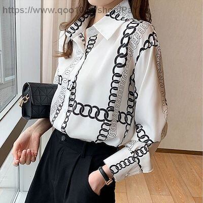レディースファッショントップスシャツブラウス袖あり長袖襟付きポロカラーシフォンプリントチェーン薄大人可愛いこなれ感総柄10203040女性用ママオフィスビジネスOL通勤デートXL